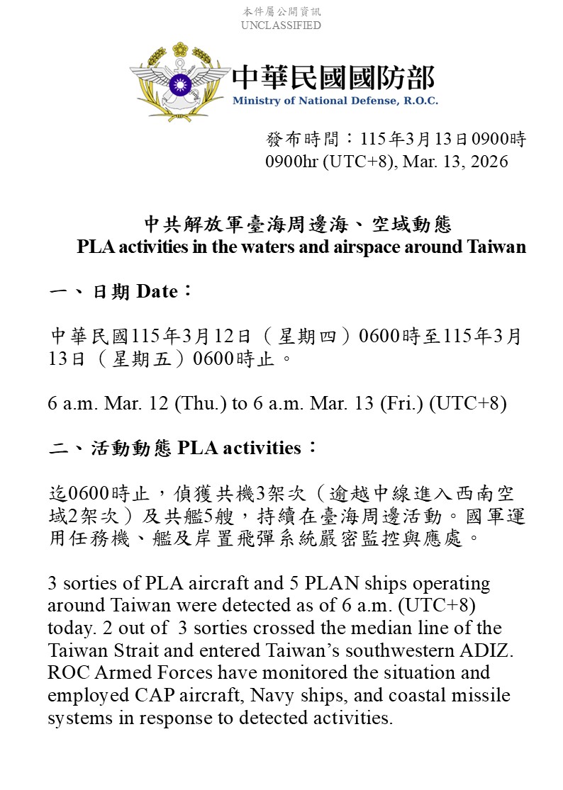 國防部發佈3/11至3/12中共解放軍台海周邊海、空域動態