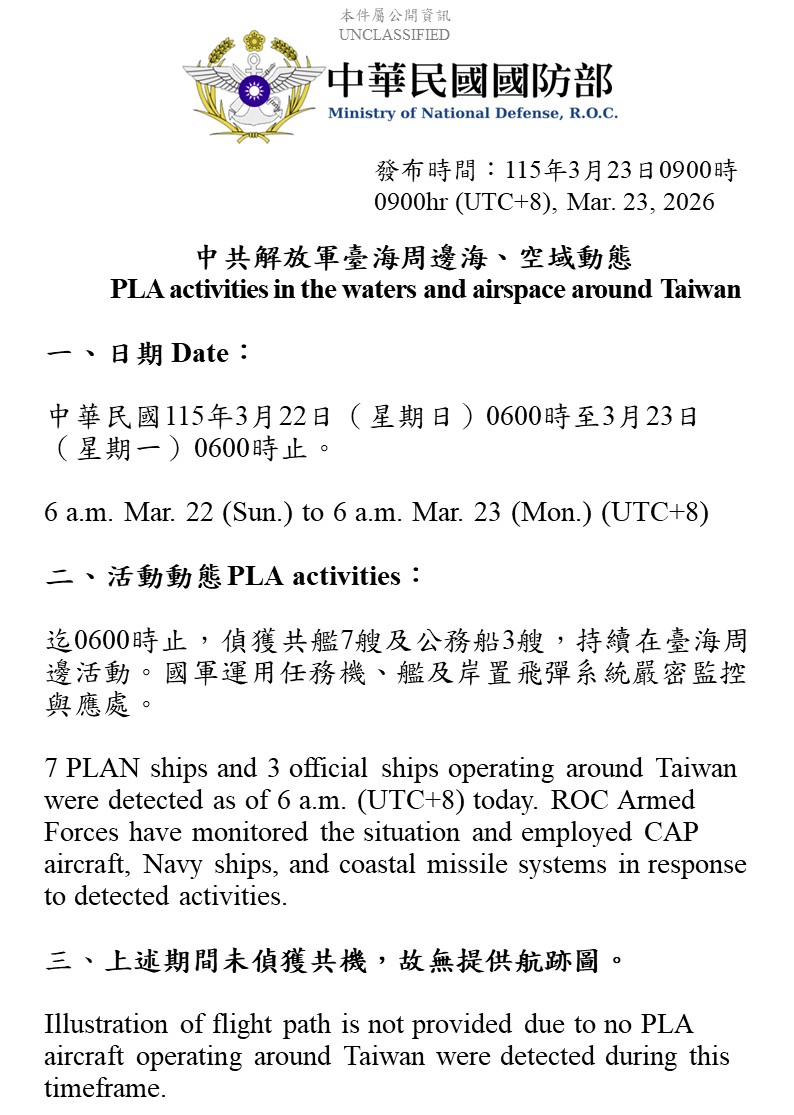 國防部發佈3/22至3/23中共解放軍台海周邊海、空域動態