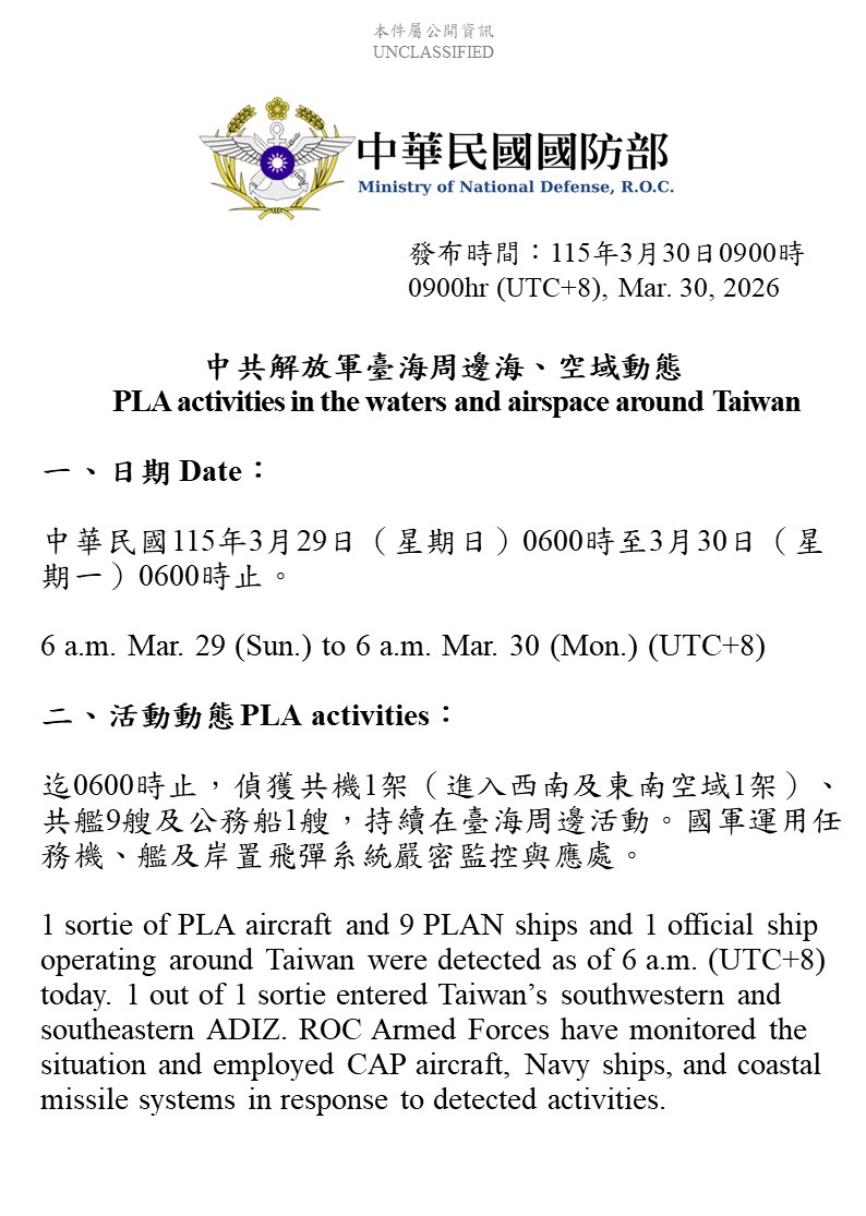 國防部發佈3/29至3/30中共解放軍台海周邊海、空域動態