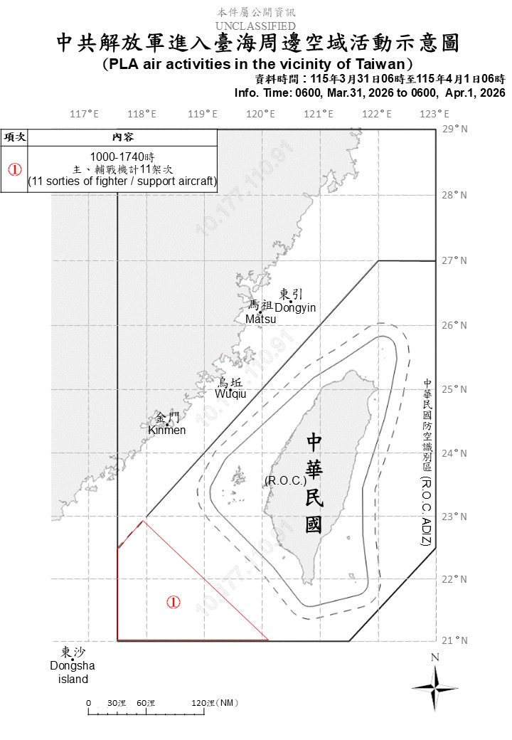 國防部發佈3/31至4/1中共解放軍台海周邊海、空域動態