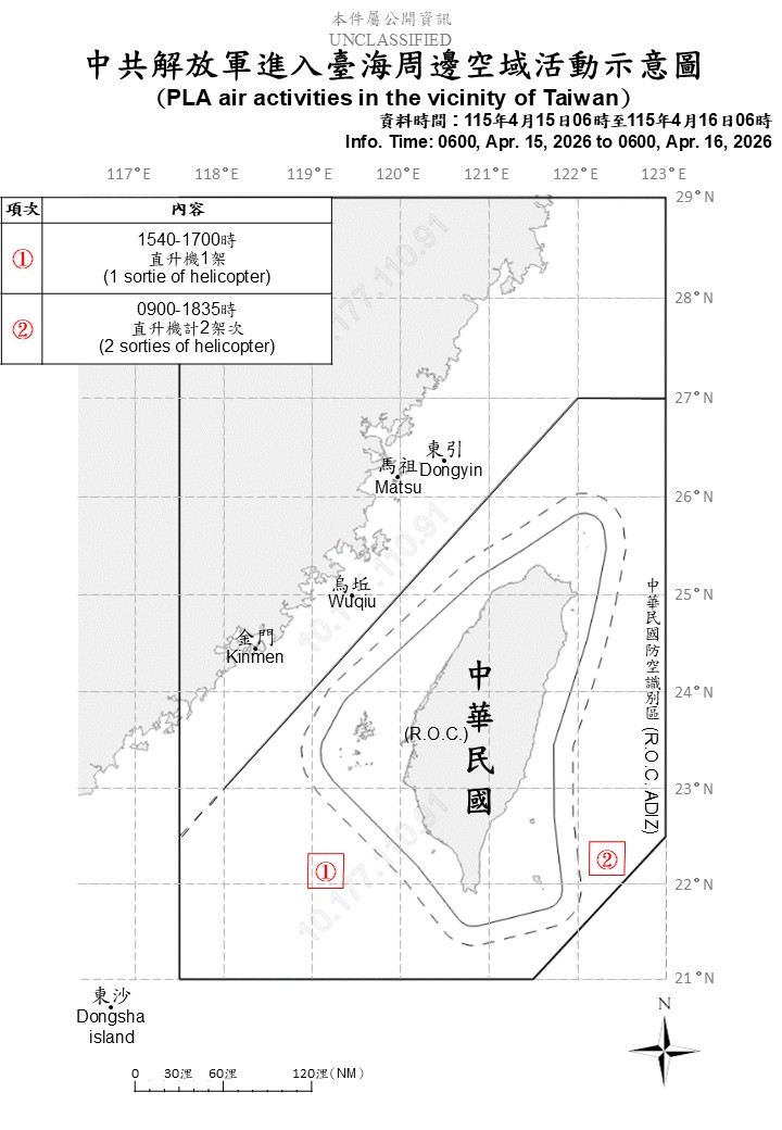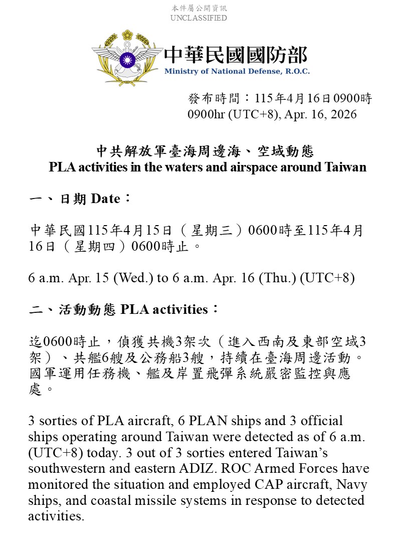 國防部發佈4月15日至4月16日中共解放軍台海周邊海、空域動態