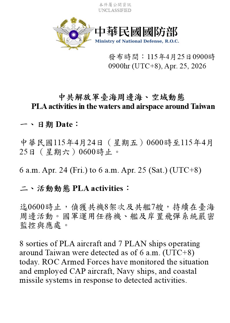 國防部發佈4月24日至4月25日中共解放軍台海周邊海、空域動態