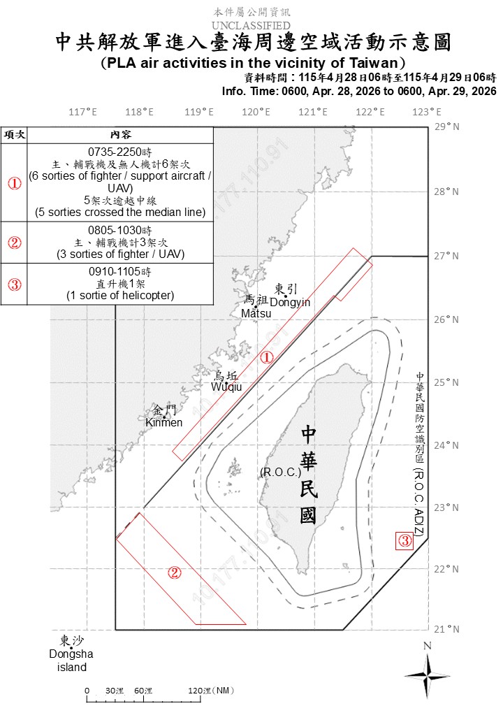 國防部發佈4月28日至4月29日中共解放軍台海周邊海、空域動態