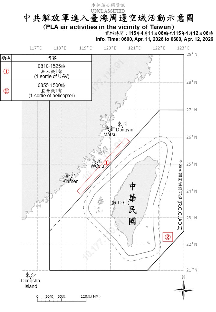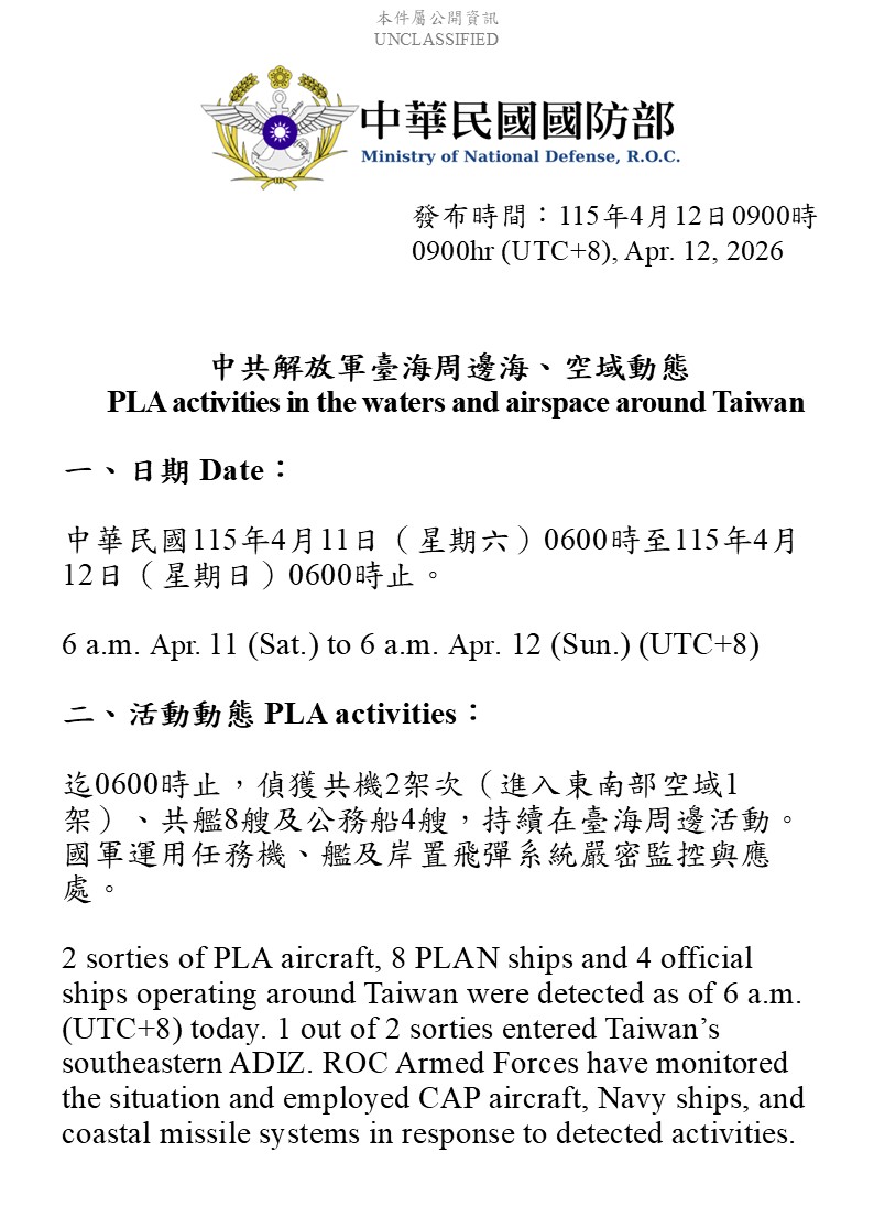 國防部發佈4/11至4/12中共解放軍台海周邊海、空域動態
