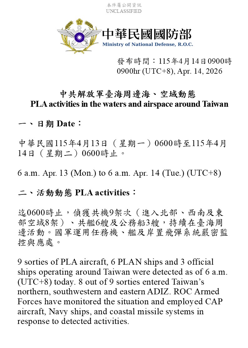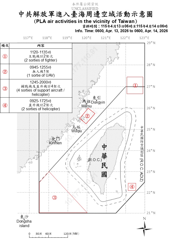 國防部發佈4/13至4/14中共解放軍台海周邊海、空域動態