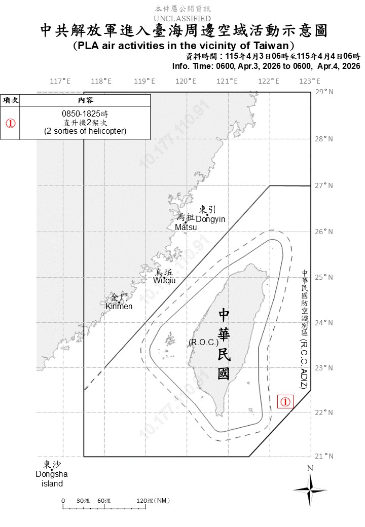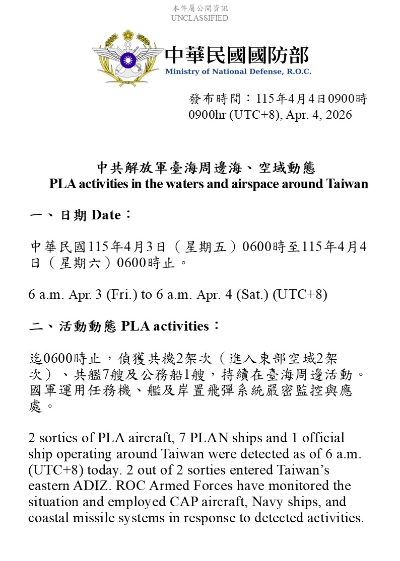 國防部發佈4/3至4/4中共解放軍台海周邊海、空域動態