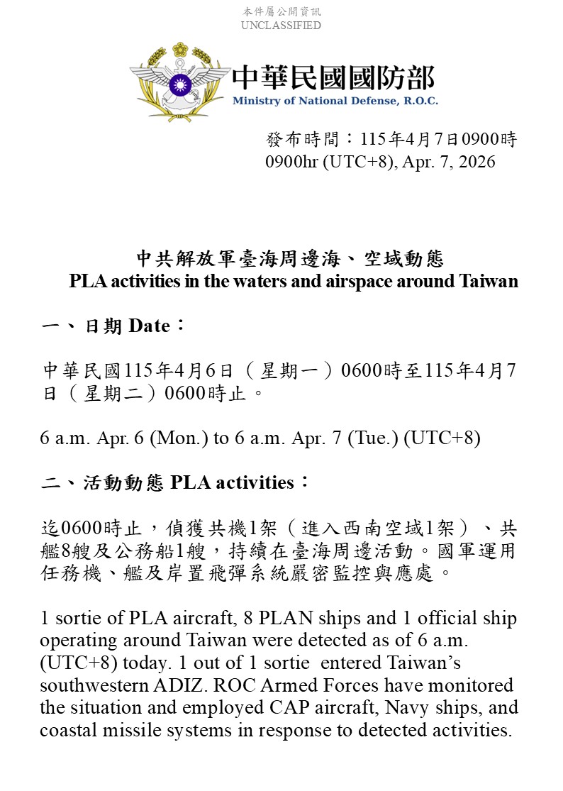 國防部發佈4/6至4/7中共解放軍台海周邊海、空域動態