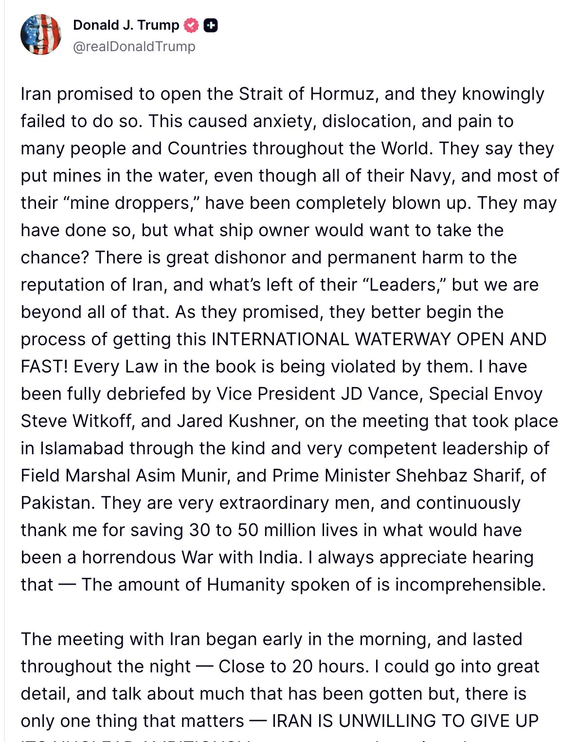 川普不滿伊朗向通行荷姆茲海峽的船隻收取通行費,曾揚言美國可以與伊合作一起收費, 顯然事與願違,「我已下令美國海軍在國際海域上,尋找並攔截所有向伊朗支付通行費的船隻。繳納非法通行費者,將無法在公海安全航行。此外,美國也將摧毀伊朗在荷莫茲海峽部署的水雷。」