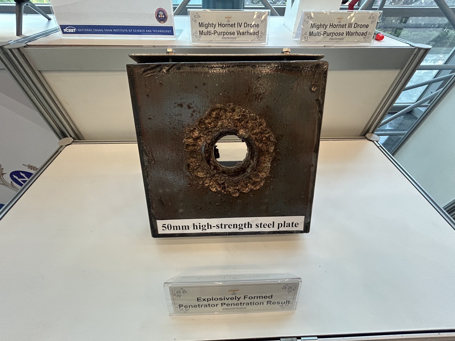 現場亦首度公開美商Kratos與中科院合作研發的「勁蜂四型」無人機。該型無人機掛載新款模組化多用途彈頭,於測試中成功貫穿50 mm厚高強度均質鋼板,展現優異的反裝甲能力。中科院化學所長施佳男表示,該彈頭為開放式介面,民間無人機亦可搭載,今年中科院將前往美國底特律參加「XPONENTIAL」無人機展,積極推動台灣無人機技術走入國際。