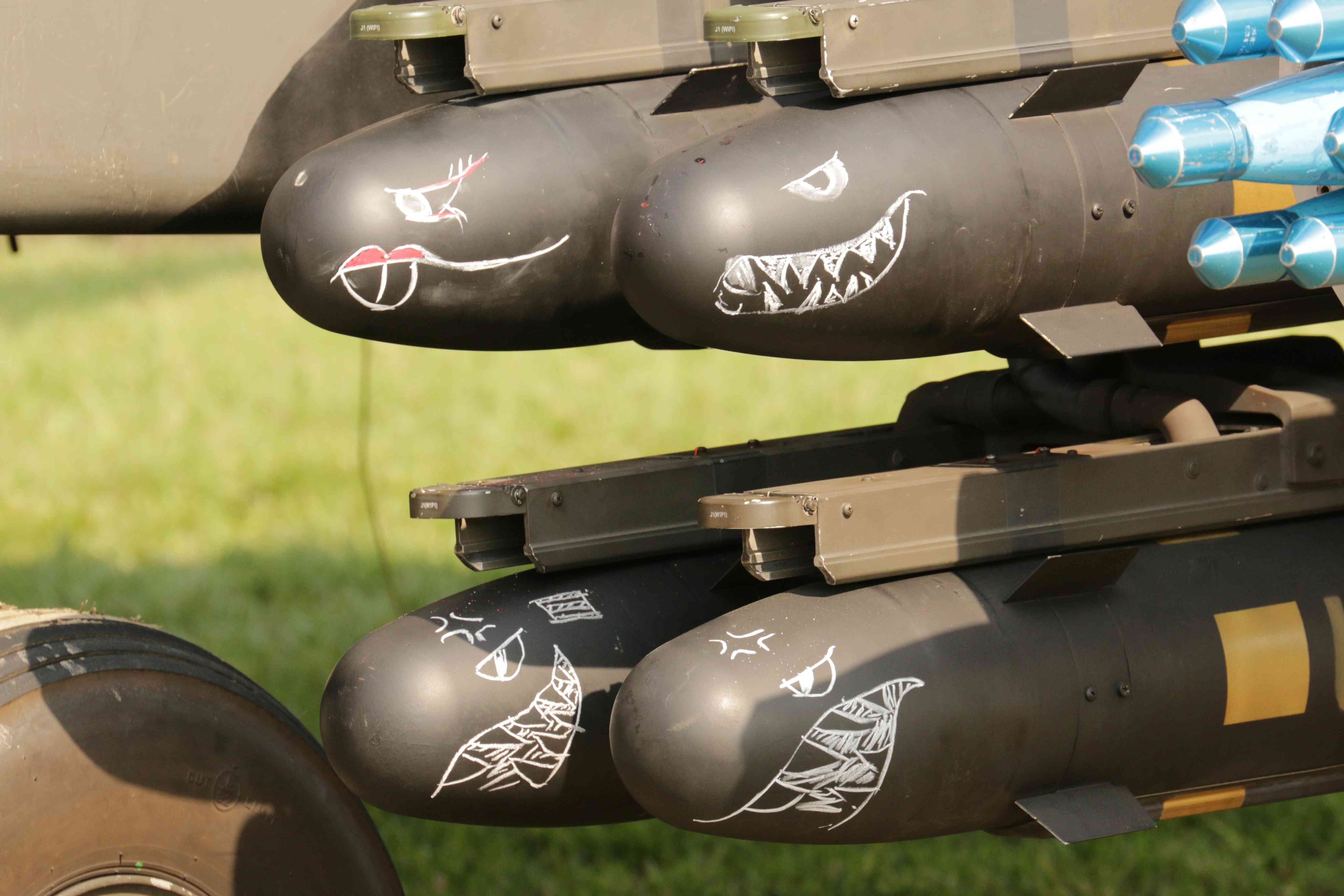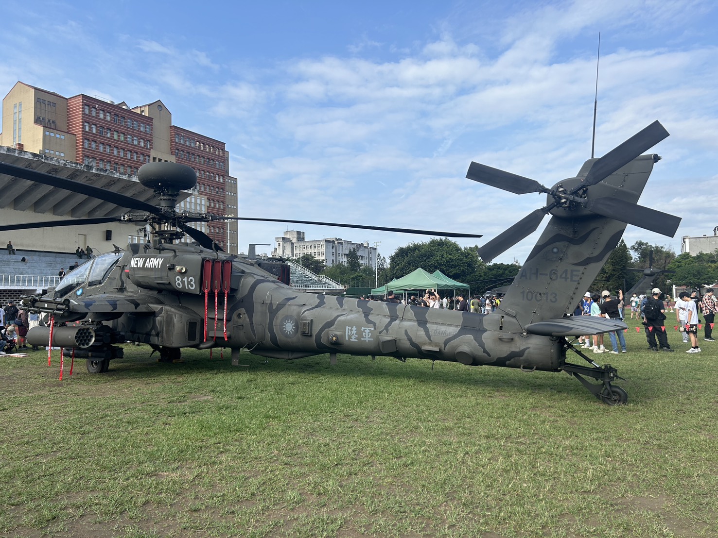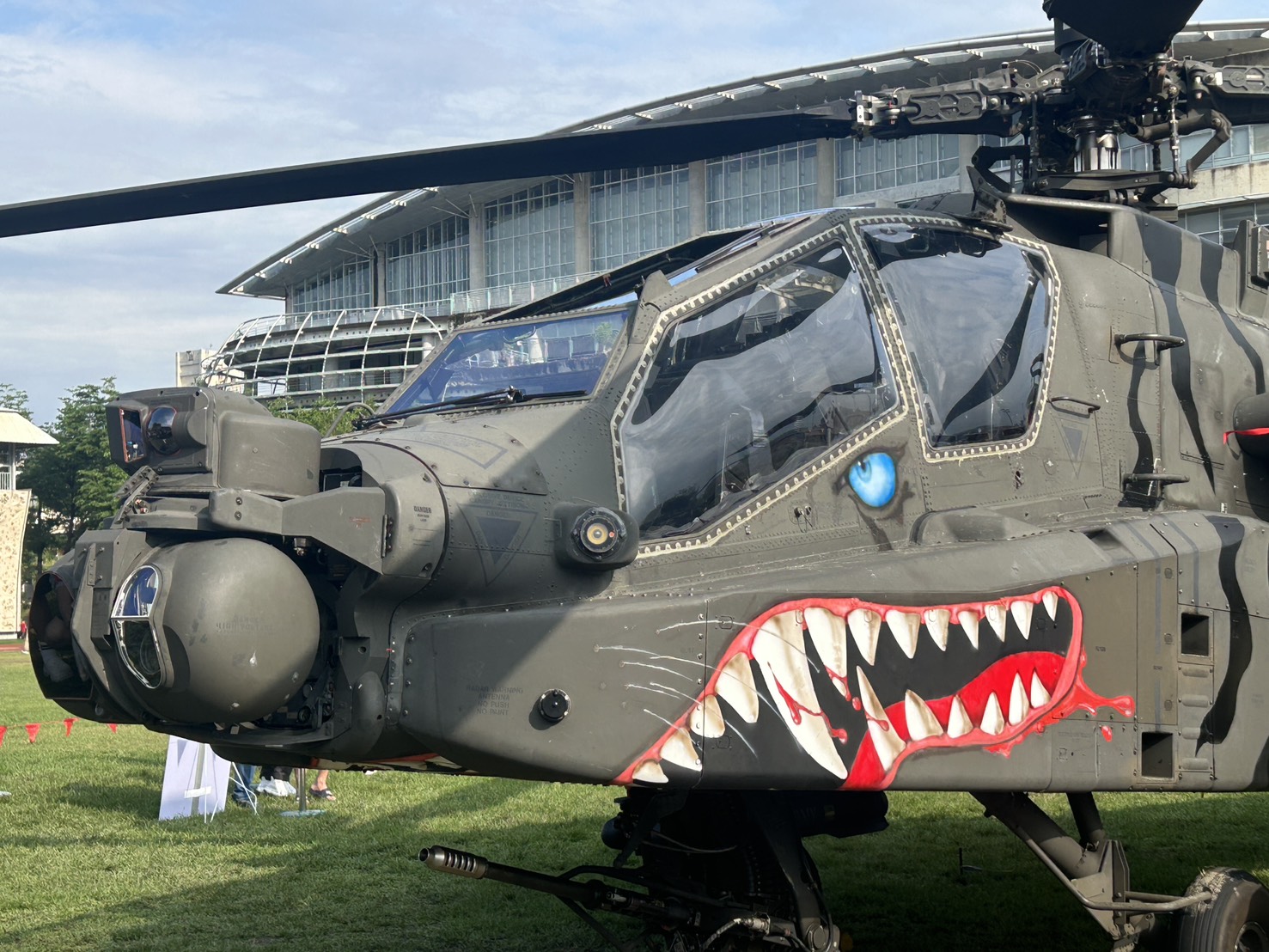本次展示的阿帕契機身編號811,機頭採用全新的「猛虎」張牙舞爪造型,機身則採亮綠、暗綠與黑色的「三色虎斑迷彩」彩繪,機腹另繪有慶祝陸軍司令部成立80周年的部慶標誌,這個「彩蛋」也展現出陸航強大氣勢。