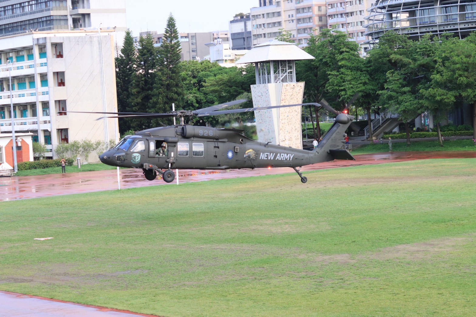 國防部與逢甲大學攜手進行全民國防教育宣導,在4月5日清晨7點半天氣放晴後,出動2架直升機空降逢甲大學大操場,地面展示至下午1點半,2架直升機才飛返駐地。